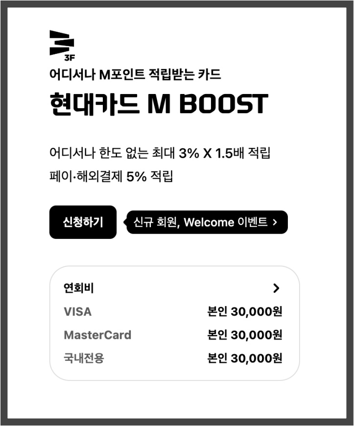 현대카드 M BOOST 카드는 M 포인트 혜택을 많이 받기 좋은 카드입니다. 현재 신규 회원 이벤트로 발급 시 3만 M 포인트를 받으실 수 있습니다.