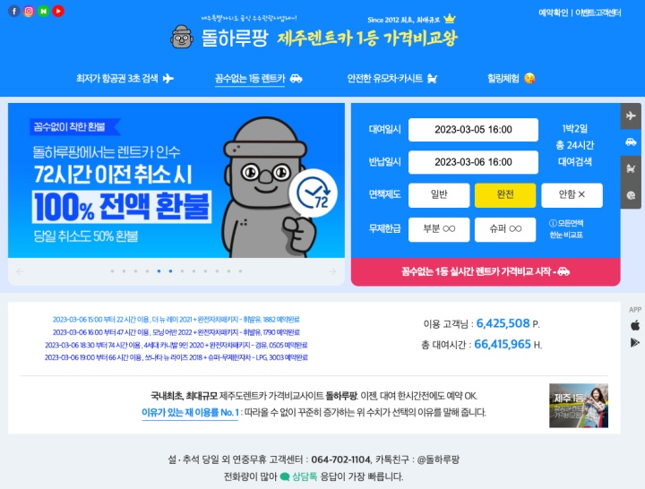 제주 돌하루팡 렌트카는 제주도 공식 우수 관광 사업체로 최저가 보상제를 운영하고 있습니다. 예약이 쉽고 간편하며 365일 고객센터 운영으로 주말에도 문의가 가능하다는 장점이 있습니다. 혹시 렌트카 예약을 취소하게 될 경우 72시간 이전 취소라면 100% 전액 환불을 받을 수 있으며, 당일 취소도 50% 환불이 가능하다는 점에서도 매리트가 있습니다.